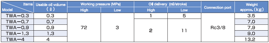 - Bơm thủy lực Osaka TWA-1.3, bơm tay thủy lực Osaka TWA-1.3, Osaka hydraulic pump TWA-1.3 là loại bơm tay thủy lực 1 chiều, thân vỏ thép, có dung tích chứa dầu 1.3 lít, áp hoạt động < 720 bar (72 MPa), chuyên dùng cho kích và tools thủy lực.