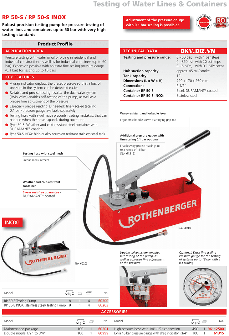 - Bơm test áp lực nước Rothenberger RP 50-S, Rothenberger testing pump RP 50-S (Code: 60200) chuyên dùng để thử áp kiểm tra áp lực nước, tình trạng dò gỉ trên các đường ống, mối nối, valve. Bơm thử áp lực nước Rothenberger RP 50-S có dải áp đo test: 0 - 60 bar, dung tích thùng chứa: 12 lít.