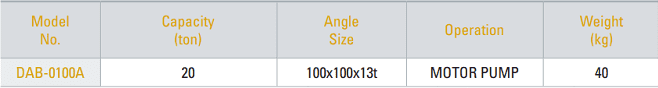- Máy cắt góc thủy lực Tonners DAB-0100A có trọng lượng: 40 kg. Được sản xuất bởi SHINJIN HYDRAULIC - BUSAN - KOREA. Made in Korea.