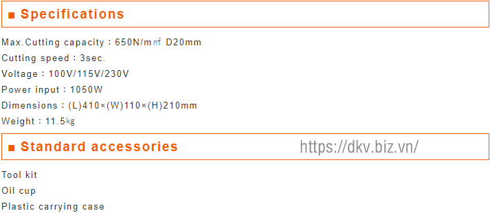 - Máy cắt thép thủy lực Diamond DFC-20WH có kích thước: 410 x 110 x 210 mm, trọng lượng: 11.5 kg.
