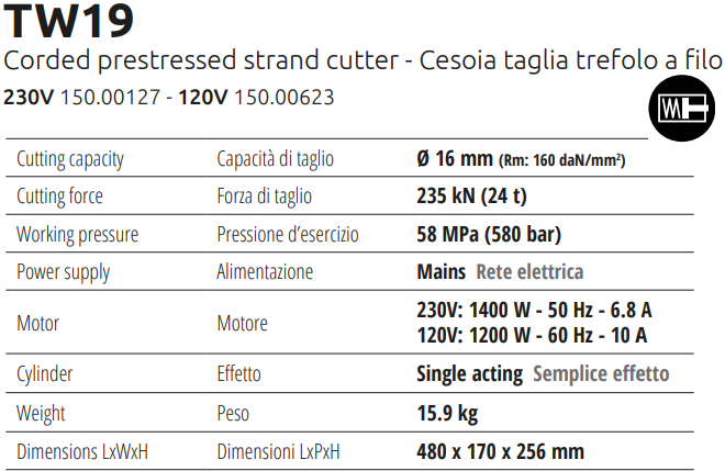 - Máy cắt thép thủy lực Edilgrappa 150.00127 có áp hoạt động < 580 bar, công suất động cơ: 1400 W, sử dụng nguồn điện 220-240V/50Hz/1ph, nguồn điện phổ dụng tại Việt Nam.