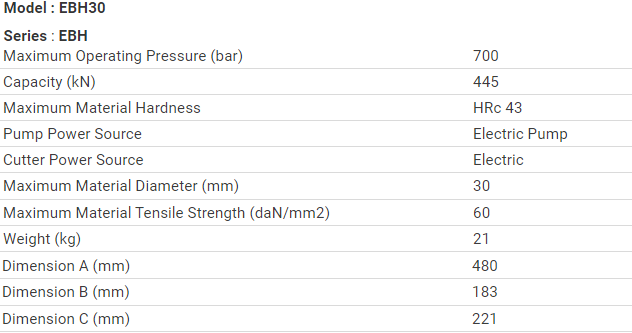 - Máy cắt thép thủy lực Enerpac EBH30, Enerpac Hydraulic Rebar Cutter EBH30 là loại máy cắt dời bơm, có lực đẩy max: 50 tấn (445 kN), khả năng cắt thép thanh size max: Ø 30 mm (HRC 43), áp hoạt động < 700 bar (70 MPa), chuyên được sử dụng trong ngành xây dựng, cơ khí, sản xuất sắt thép.