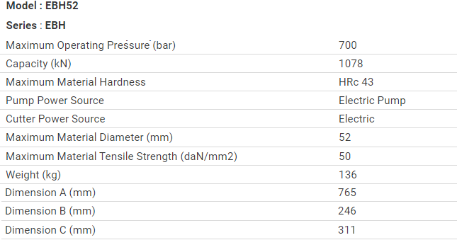 - Máy cắt thép thủy lực Enerpac EBH52, Enerpac Hydraulic Rebar Cutter EBH52 là loại máy cắt dời bơm, có lực đẩy max: 121 tấn (1.078 kN), khả năng cắt thép thanh size max: Ø 52 mm (HRC 43), áp hoạt động < 700 bar (70 MPa), chuyên được sử dụng trong ngành xây dựng, cơ khí, sản xuất sắt thép.