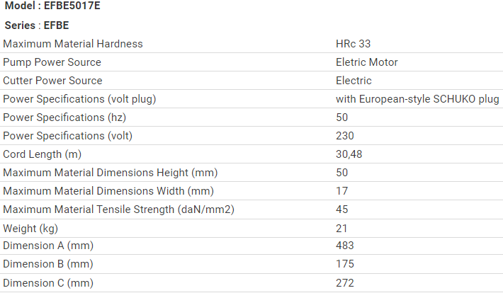 - Máy cắt thép thủy lực Enerpac EFBE5017E, Enerpac Electric Hydraulic Rebar Cutter EFBE5017E là loại máy có lực đẩy max: 29.8 tấn, khả năng cắt thép tấm/phẳng size : 17 x 50 mm (HRC 33), chuyên được sử dụng trong ngành xây dựng, cơ khí, sản xuất sắt thép.