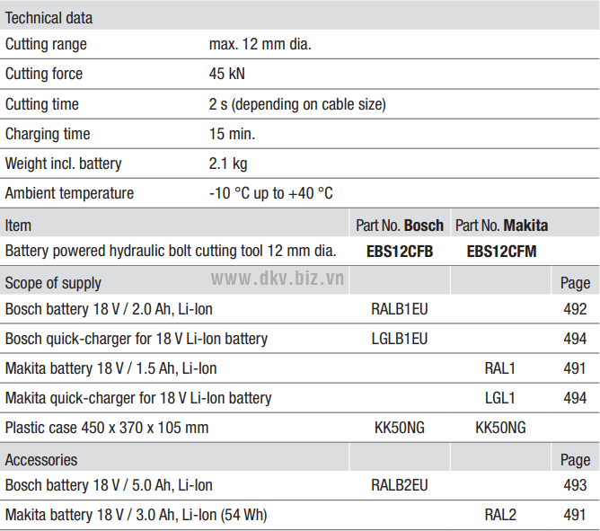 - Máy cắt thép thủy lực Klauke EBS 12 được trang bị pin kép (18V/5 Ah) kèm sặc sử dụng nguồn điện 220-240V/50Hz/1ph, công nghệ sặc nhanh. Tốc độ cắt 2 giây .