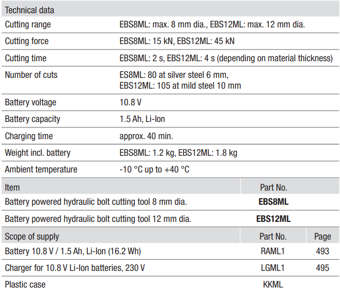 - Máy cắt thép thủy lực Klauke EBS 12 ML được trang bị pin kép (18V/4 Ah) kèm sặc sử dụng nguồn điện 220-240V/50Hz/1ph, công nghệ sặc nhanh. Tốc độ cắt 4 giây .