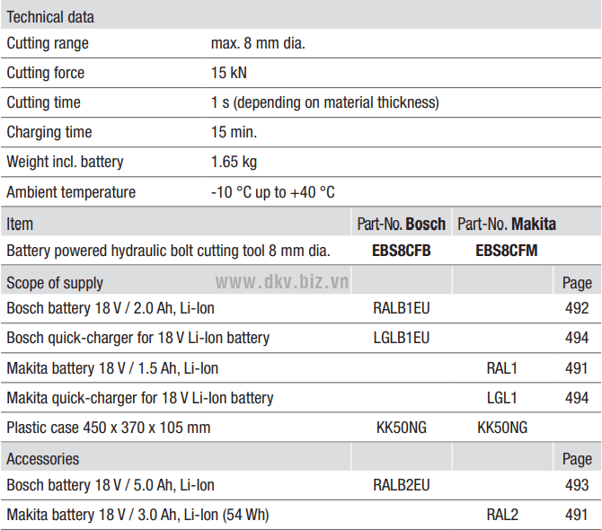 - Máy cắt thép thủy lực Klauke EBS 8 được trang bị pin kép (18V/4 Ah) kèm sặc sử dụng nguồn điện 220-240V/50Hz/1ph, công nghệ sặc nhanh. Tốc độ cắt 1 giây .