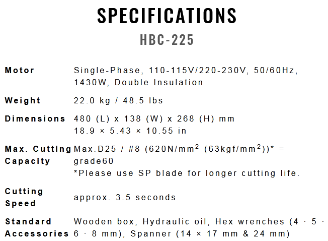 - Máy cắt thép thủy lực Ogura HBC-225 có công suất động cơ: 1430 W, sử dụng nguồn điện 220-240V/50Hz/1ph, nguồn điện phổ dụng tại Việt Nam. Tốc độ cắt 3.5 giây .