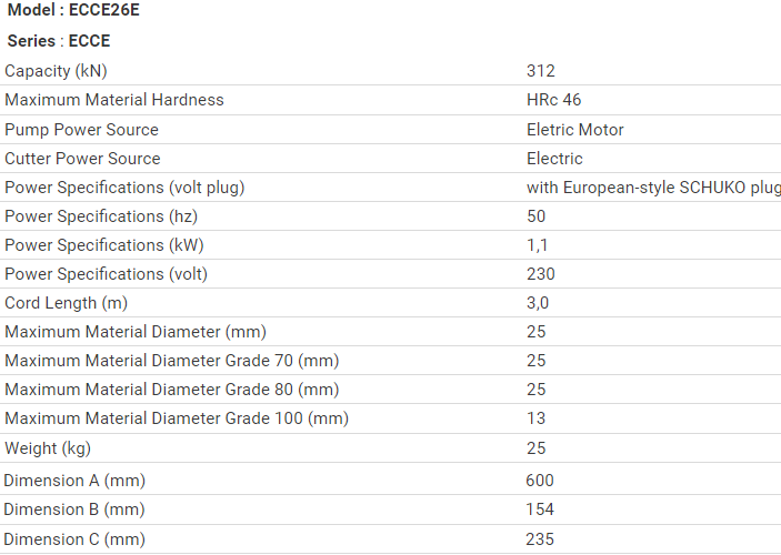 - Máy cắt xích thủy lực Enerpac ECCE26E có kích thước: 600 x 154 x 235 mm, trọng lượng: 25 kg.