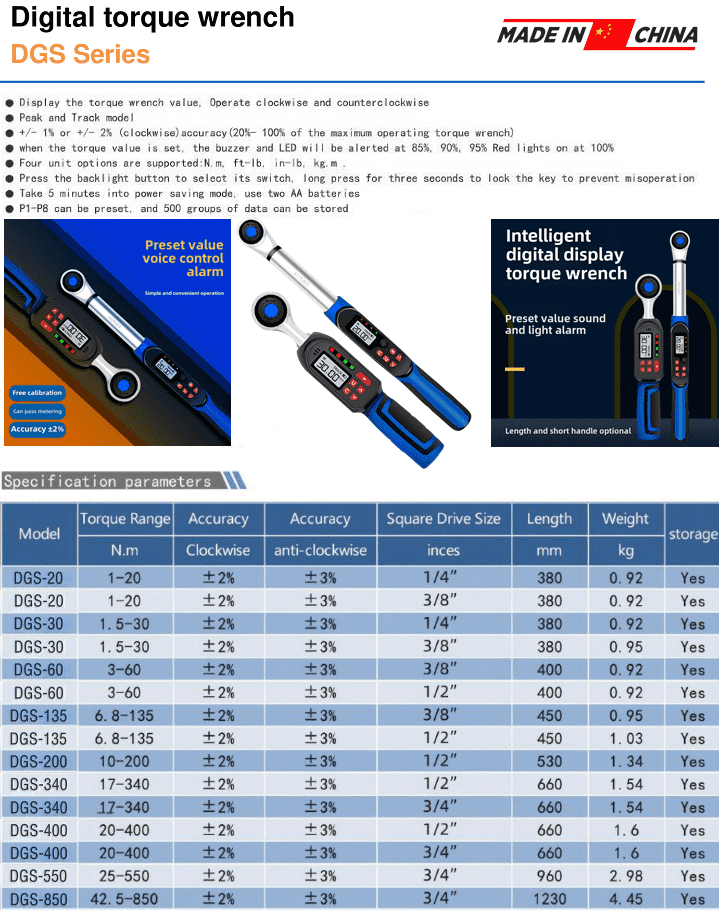 - Cờ lê lực điện tử DGS-60, Digital torque wrench DGS-60: thuộc loại cờ lê lực điện tử đầu liền, dùng khẩu để siết lực chính xác trong công nghiệp. Dải lực siết: 3 - 60 N.m, với size nhét đầu khẩu: 3/8". Sai số theo nhà sản xuất nêu: +/- 2% (siết theo chiều kim đồng hồ) và +/-3% (siết theo ngược chiều kim đồng hồ), chế tạo theo tiêu chuẩn DIN EN ISO 6789:2017(E).
