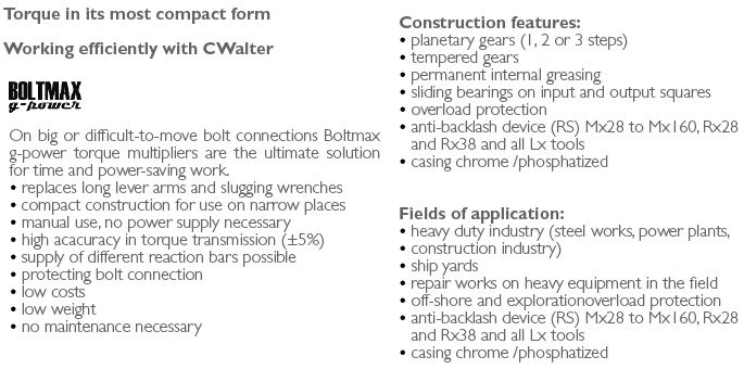 - Cờ lê nhân lực Carl Walter Mx8, Carl Walter torque multiplier Mx8 có lực siết max: 800 N.m, với hệ số nhân: 3.5:1, chuyên dùng để siết lực (moment) chính xác các loại bulong, đai ốc cỡ lớn trong công nghiệp. Cờ lê nhân lực Carl Walter Mx8 thuộc dạng cờ lê nhân lực kiểu cao.