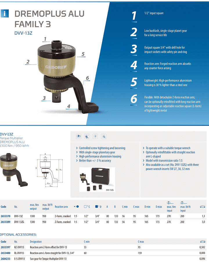 - Bản chất của cờ lê nhân lực Gedore DVV-13ZG là một hộp giảm tốc (phối hợp nhiều bánh răng) theo một tỷ số truyền nhất định. Căn cứ vào đó, cho một hệ số nhân lực (đầu ra/đầu vào). Lực đầu vào được cài đặt chính xác theo một cờ lê lực loại nhỏ đi kèm.