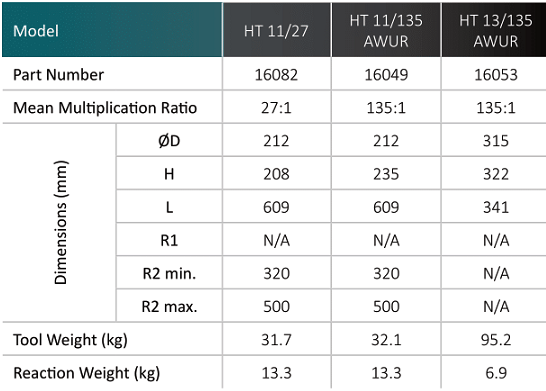 - Thân cờ lê nhân lực Norbar HT 13/135 AWUR (16053) cùng càng phản lực được chế tạo bằng thép cường lực có độ dai va đập cao, chịu lực vặn xoắn tốt. Trọng lượng của cờ lê nhân lực HT 13/135 AWUR (16053): 102.1 kg (bộ nhân lực: 95.2 kg, càng phản lực: 6.9 kg). Đường kính thân D = 315 mm.