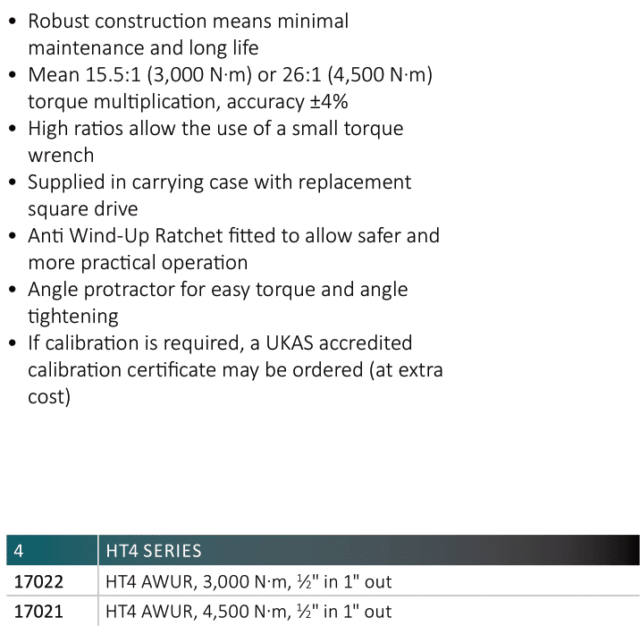 - Cờ lê nhân lực Norbar HT4 15.5:1, 3000 N·m, Norbar torque multiplier HT4 15.5:1, 3000 N·m (Code: 17022): là dụng cụ chuyên dụng để siết lực (moment) chính xác các loại bulong cường độ cao trong công nghiệp, với lực siết max: 3.000 N.m, hệ số nhân: 15.5:1, cỡ khẩu vào: 1/2", cỡ khẩu ra: 1".