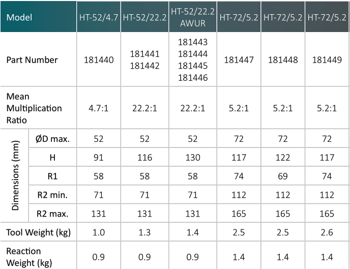 - Thân cờ lê nhân lực Norbar HT-52/22.2 AWUR (181446) cùng càng phản lực được chế tạo bằng thép cường lực có độ dai va đập cao, chịu lực vặn xoắn tốt. Trọng lượng của cờ lê nhân lực HT-52/22.2 (180206): 2.15 kg (bộ nhân lực: 1.3 kg, càng phản lực: 0.85 kg). Đường kính thân D = 52 mm.