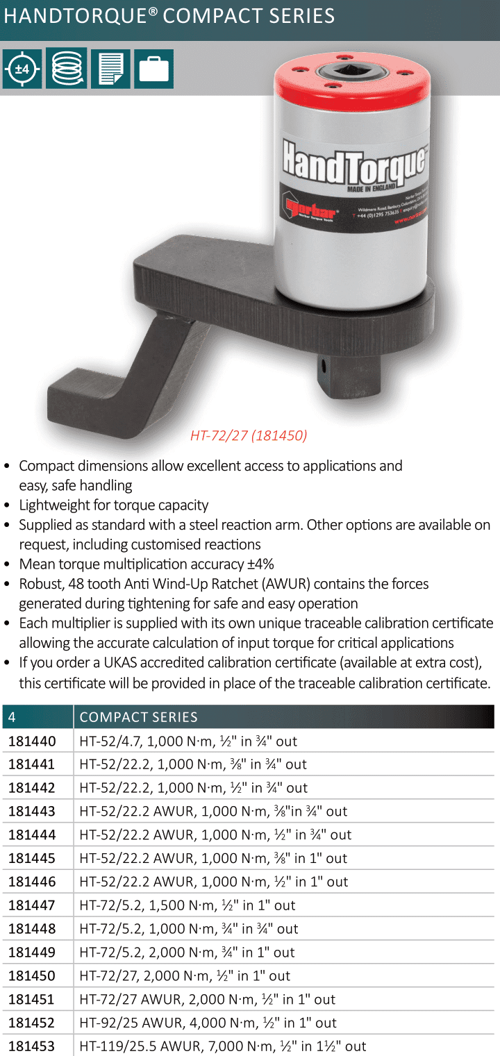 - Cờ lê nhân lực Norbar HT-92/25 AWUR(Code: 181452), Norbar torque multiplier HT-92/25 AWUR(Code: 181452): thuộc dòng sản phẩm Compact Series, là dụng cụ chuyên dụng để siết lực (moment) chính xác các loại bulong cường độ cao trong công nghiệp, với lực siết max: 4.000 N.m, hệ số nhân: 25:1, cỡ khẩu vào: 1/2", cỡ khẩu ra: 1".