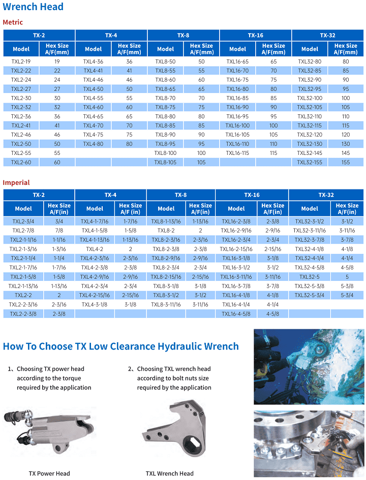 - Để phù hợp với các size bulong trong dải cần siết thông thường người ta chọn 1 xylanh cờ lê thủy lực TX-16 (cylinder) phối cho nhiều size tròng cờ lê thủy lực (ratchet link), kết hợp với lót (reducer) để đạt hiệu quả kinh tế tốt hơn. Để tư vấn, chọn lựa tối ưu, hãy liên hệ với chúng tôi.