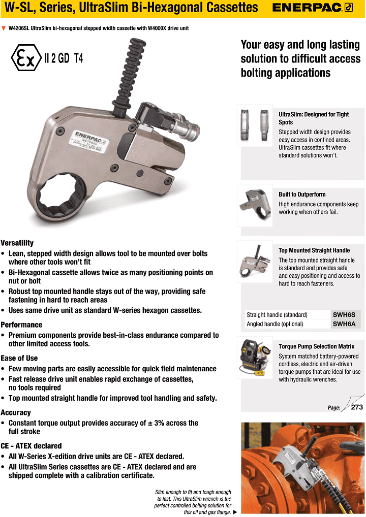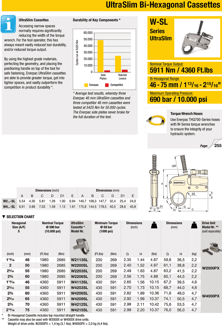 - Tròng cờ lê thủy lực Enerpac W2113SL, Enerpac bi-hexagon ratchet link W2113SL được sử dụng với xylanh cờ lê thủy lực Enerpac W2000X hoặc W2000PX (276 - 2.766 N.m), siết đai ốc 12 cạnh size: 46 mm, để tạo thành bộ cờ lê thủy lực tròng hoàn chỉnh.