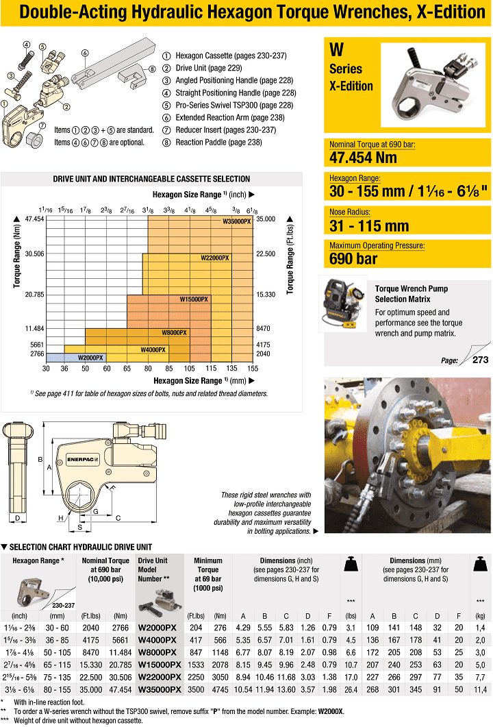 - Xylanh cờ lê thủy lực Enerpac W2000PX, Enerpac cylinder low hydraulic torque wrench W2000PX: là loại xylanh dùng cho cờ lê thủy lực đầu tròng, chuyên dùng để siết lực chính xác các loại bulong lục giác: 30 - 60 mm, với dải siết lực max: 276 - 2.766 N.m, trong công nghiệp. Xylanh cờ lê thủy lực Enerpac W2000PX hoạt động ở áp < 700 bar, do hãng Enerpac sản xuất.