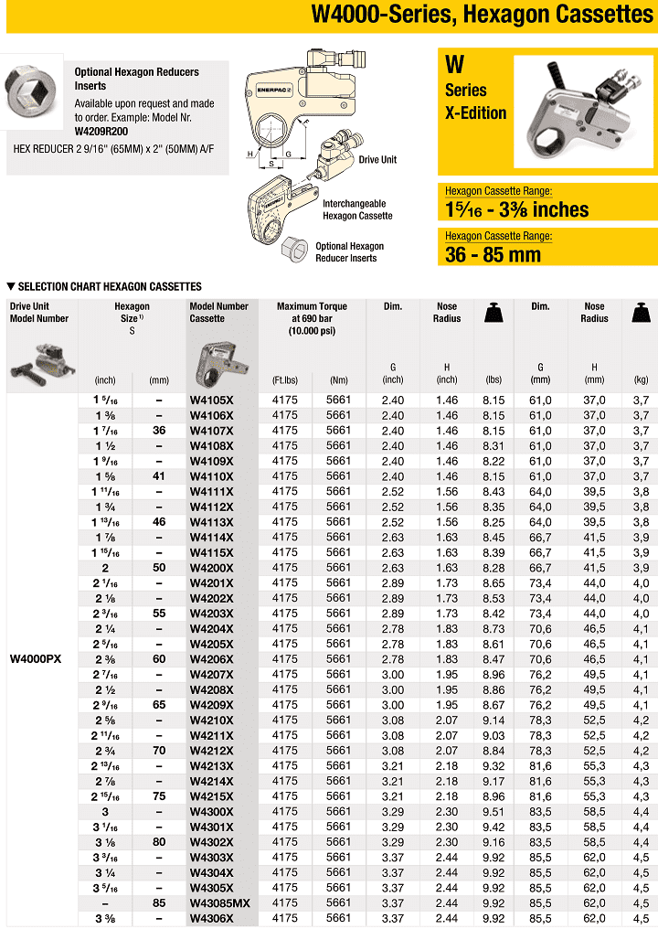 - Xylanh cờ lê thủy lực Enerpac W4000X, Enerpac cylinder low hydraulic torque wrench W4000X: là loại xylanh dùng cho cờ lê thủy lực đầu tròng, chuyên dùng để siết lực chính xác các loại bulong lục giác: 36 - 85 mm, với dải siết lực max: 566 - 5.661 N.m, trong công nghiệp. Xylanh cờ lê thủy lực Enerpac W4000X hoạt động ở áp < 700 bar, do hãng Enerpac sản xuất.