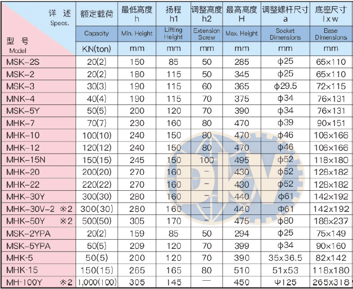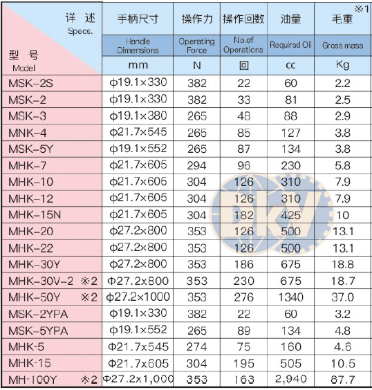 - Kích thủy lực Masada MH-100Y có tiết diện khối đế (l x w): 265 x 318 mm, tiết diên đỉnh kích chịu tải (a): Ø125 mm, dung tích dầu 2.94 lít, sử dụng tay công 1 khúc (Ø 27.2 mm x dài 1.000 mm) để tạo lực đẩy bơm thủy lực 1 cấp tốc độ, với lực đẩy tay max: 353 N. Trọng lượng: 87.7 kg.