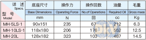 - Kích thủy lực Masada MH-5LS-1 có tiết diện khối đế: 90 x 151 mm, tiết diện đỉnh kích chịu tải: 35x36.5 mm, dung tích dầu 195 cc, sử dụng tay công 2 đoạn để tạo lực đẩy bơm thủy lực 1 cấp tốc độ, với lực đẩy tay max: 235 N. Trọng lượng: 6.3 kg. Đóng gói: hộp carton, theo tiêu chuẩn của nhà sản xuất Masada.