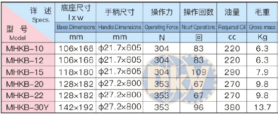 - Kích thủy lực Masada MHKB-10 có tiết diện khối đế (l x w): 106 x 166 mm, tiết diên đỉnh kích chịu tải (a): Ø 46 mm, dung tích dầu 220 cc, sử dụng tay công 3 đoạn (Ø 21.7 mm x dài 605 mm) để tạo lực đẩy bơm thủy lực 1 cấp tốc độ, với lực đẩy tay max: 304 N. Trọng lượng: 6.3 kg.