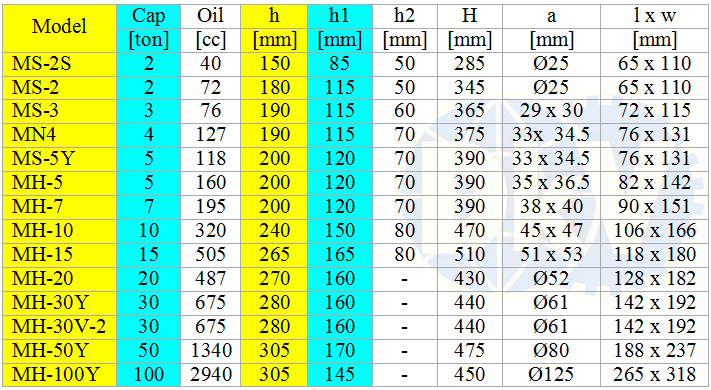 - Con đội thủy lực Masada MS-2S, kích thủy lực Masada MS-2S, Masada hydraulic bottle jack MS-2S: là loại con đội thủy lực lắc tay, có sức nâng max: 2 tấn, hành trình max (h1): 85 mm, chiều cao tĩnh khi chưa nâng (h): 150 mm, chiều cao kéo dài vặn ren (h2): 50 mm, chiều cao tối đa khi lên hết hành trình, kể cả nới trục ren (H): 285 mm, do Masada | Japan sản xuất.