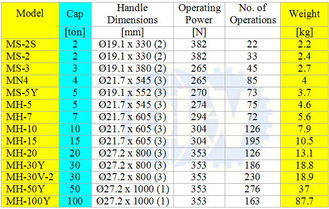 - Kích thủy lực Masada MS-2S có tiết diện khối đế (l x w): 65 x 110 mm, đường kính đỉnh kích: Ø25 mm, dung tích dầu 40 cc, sử dụng tay công 2 đoạn (Ø 19.1 mm x dài 330 mm) để tạo lực đẩy bơm thủy lực 1 cấp tốc độ, với lực đẩy tay max: 382 N. Trọng lượng: 2.2 kg.
