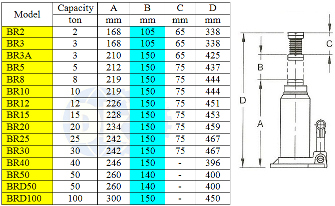 - Con đội thủy lực Mega BR2, Mega hydraulic bottle jack BR2: có sức nâng max: 2 tấn, chiều cao tĩnh ban đầu (A): 168 mm, hành trình max (B): 105 mm, chiều cao nâng tối đa (D): 338 mm, phần nối dài ren (C): 65 mm.