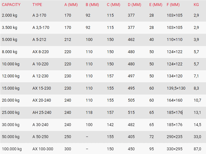 - Kích thủy lực Weber A 2-170 có tiết diện khối đế (F): 103 x 105 mm, tiết diên đỉnh kích chịu tải (E): Ø28 mm, sử dụng tay công 2 đoạn để tạo lực đẩy bơm thủy lực 1 cấp tốc độ. Trọng lượng: 2.9 kg.