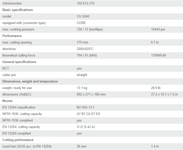 - Đầu cắt thủy lực Holmatro CU 5040 có kích thước bao: 692 x 271 x 190 mm, trọng lượng: 13.1 kg, được chế tạo và sản xuất bởi Holmatro Rescue Equipment B.V. Made in Netherlands.