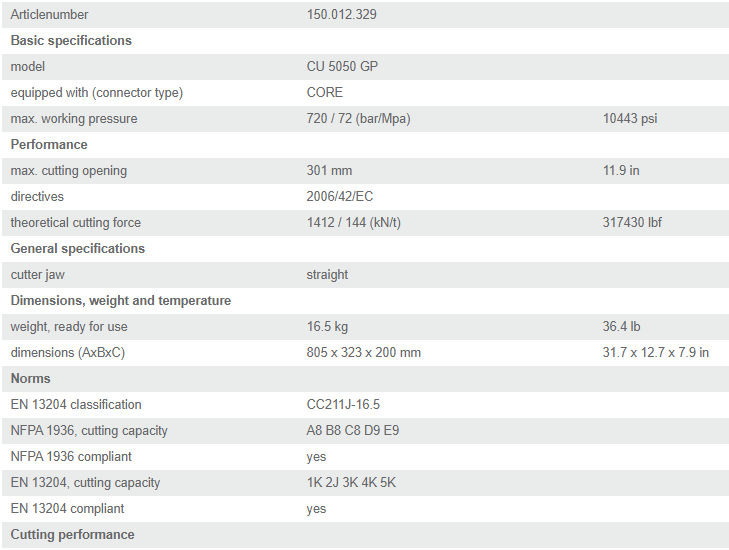 - Đầu cắt thủy lực Holmatro CU 5050 GP có kích thước bao: 805 x 323 x 200 mm, trọng lượng: 16.5 kg, được chế tạo và sản xuất bởi Holmatro Rescue Equipment B.V. Made in Netherlands.