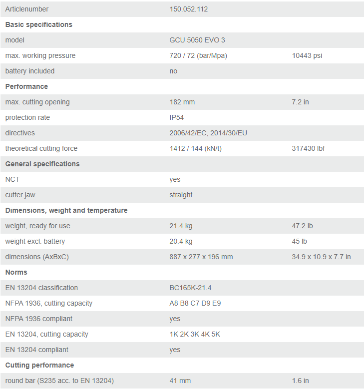 - Đầu cắt thủy lực Holmatro GCU 5050 EVO 3 có kích thước bao: 887 x 227 x 196 mm, trọng lượng: 21.4 kg, được chế tạo và sản xuất bởi Holmatro Rescue Equipment B.V. Made in Netherlands.