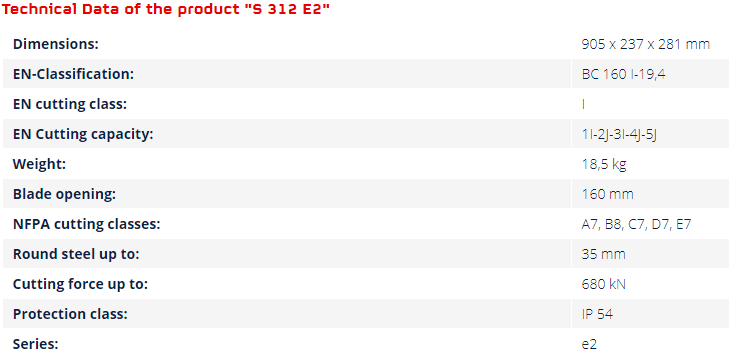 - Đầu cắt thủy lực Lukas S 312 E2 được chế tạo theo tiêu chuẩn: EN 13204, có trọng lượng nhẹ, có độ bền cao được rèn để có hiệu suất cắt tốt hơn và tuổi thọ dài hơn, với lưỡi làm bằng hợp kim đặc biệt được thiết để cắt các bộ phận thân xe.