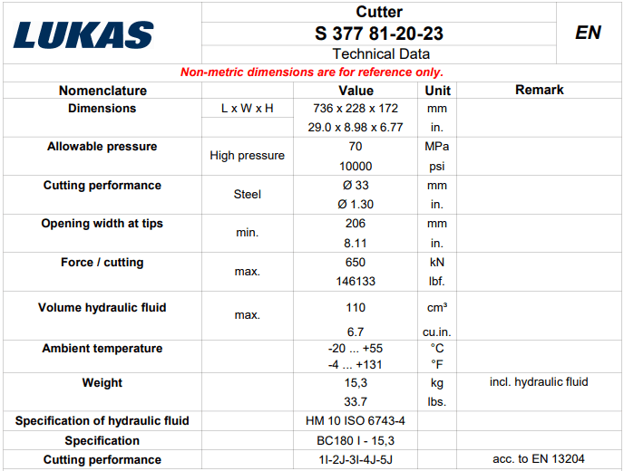 - Đầu cắt thủy lực Lukas S 377 có kích thước bao: 736 x 228 x 172 mm, trọng lượng: 15.3 kg, được chế tạo và sản xuất bởi LUKAS Hydraulik GmbH. Made in Germany.
