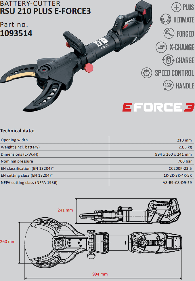 - Đầu cắt thủy lực Weber RSU 210 PLUS E-FORCE3 có kích thước bao: 994 x 260 x 241 mm, trọng lượng: 23.5 kg, được chế tạo và sản xuất bởi Webber + Hydraulik GmbH. Made in Germany.