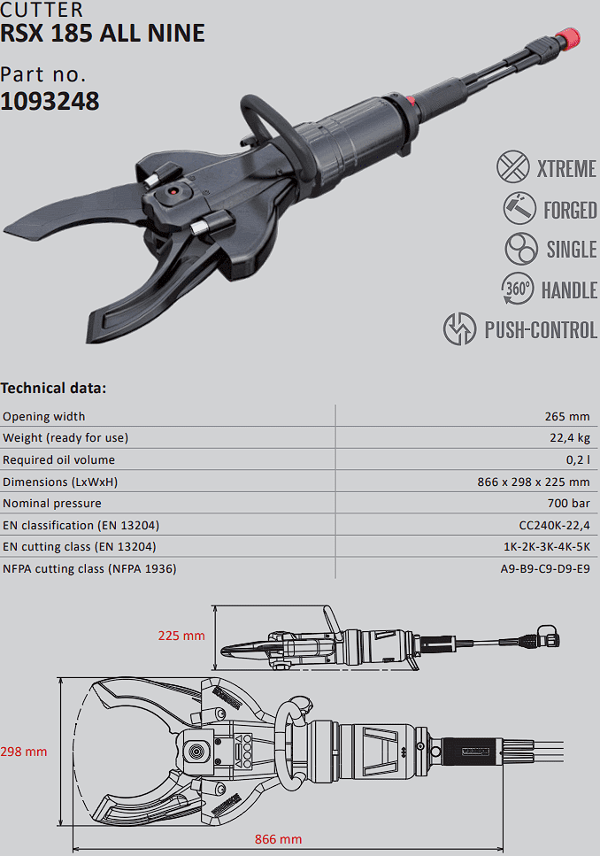 - Đầu cắt thủy lực RSX 185 ALL NINE, Weber hydraulic cutter RSX 185 ALL NINE: là loại đầu cắt thủy lực đa năng dời bơm, chuyên dùng để như thép thanh, thép tấm, cáp, ống trụ...trong công nghiệp, đặc biệt trong công tắc cứu hộ, cứu nạn. Đầu cắt thủy lực Weber RSX 185 ALL NINE size độ mở max: Ø 265 mm, áp hoạt động < 700 bar (70 MPa).