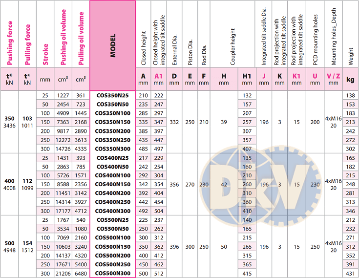 - Kích thủy lực Europress COS350N25, con đội thủy lực Europress COS350N25, Europress double acting hydraulic jack COS350N25: là loại kích thủy lực, con đội thuỷ lực 2 chiều lớn, vỏ thép, có sức nâng max: 350 tấn, hành trình max: 25 mm, chuyên dùng nâng hạ trong công nghiệp.Áp hoạt động < 700 bar (70 MPa), với coupler tiêu chuẩn 3/8"-NPT cho phép đấu nối nhanh với bơm thủy lực, thông qua ống dây, phụ kiện thủy lực.