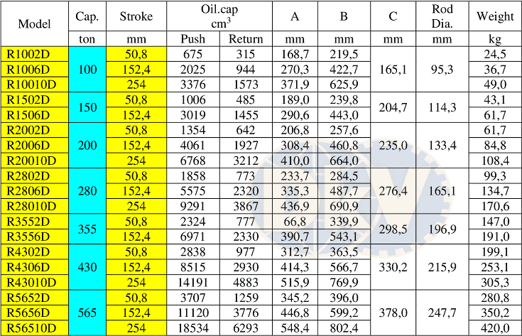 - Kích thủy lực Power Team R1002D, kích thủy lực 2 chiều Power Team R1002D, Power Team double acting hydraulic jack R1002D: là loại kích thủy lực, con đội thủy lực 2 chiều, thân vỏ thép, có sức nâng max: 100 tấn, hành trình max: 50.8 mm, chuyên dùng trong nâng hạ công nghiệp.