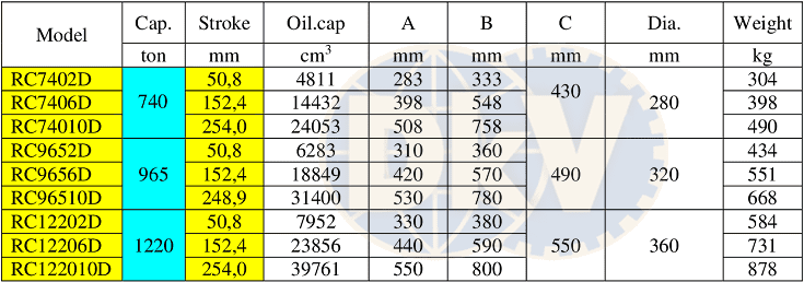 - Kích thủy lực Power Team RC7402D, kích thủy lực 2 chiều vỏ thép Power Team RC7402D, Power Team double acting hydraulic jack RC7402D: là loại kích thủy lực, con đội thủy lực 2 chiều, thân vỏ bằng thép, có sức nâng max: 740 tấn, hành trình max: 50 mm, chuyên dùng nâng hạ trong công nghiệp.