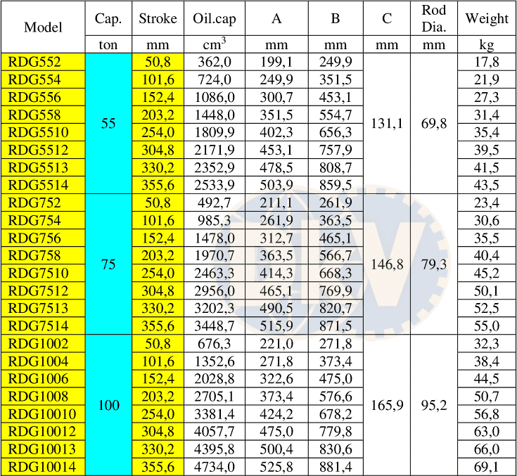 - Kích thủy lực Power Team RDG1002, kích thủy lực hai chiều Power Team RDG1002, Power Team double acting hydraulic jack RDG1002: là loại kích thủy lực 2 chiều, vỏ thép, loại lớn có sức nâng max: 100 tấn, hành trình max: 50.8 mm, áp họat động < 700 bar (10.000 psi).