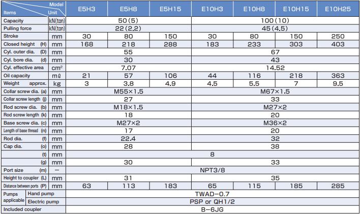 Một bộ kích thủy lực E10H3 hoàn chỉnh: sẽ bao gồm thêm bơm thủy lực TWAD-0.7, ống dây thủy lực 2m có tích hợp coupler và áp kế