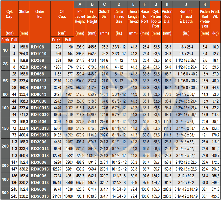 - Kích thủy lực Power Team RD106, kích thủy lực hai chiều Power Team RD106, Power Team double acting hydraulic jack RD106: là loại kích thủy lực 2 chiều, vỏ thép, loại nhỏ, có ren ở đầu kích, sức nâng max: 10 tấn, hành trình max: 158.8 mm, áp họat động < 700 bar (10.000 psi).