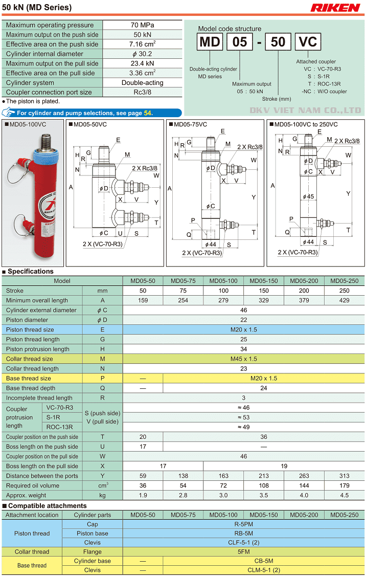 - Kích thủy lực 2 chiều Riken MD05-50 có trọng lượng: 1.9 kg, được sản xuất tại nhà máy RIKEN KIKI đặt tại Tokyo, Nhật Bản. Made in Japan (CO Phòng thương mại Osaka | Japan). DKV VIET NAM CO.,LTD nhập khẩu trực tiếp từ Nhật Bản và phân phối service.