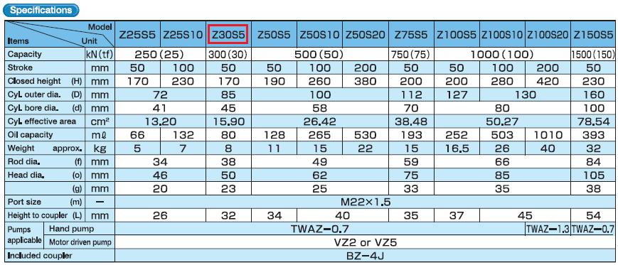 - Áp hoạt động kích thủy lực Osaka Z30S5 thuộc loại cao áp < 2.000 bar (200 MPa), với coupler đặc chủng dạng bắt ren BZ-4J, cho phép đấu nối nhanh với bơm thủy lực, thông qua ống dây, phụ kiện thủy lực.
