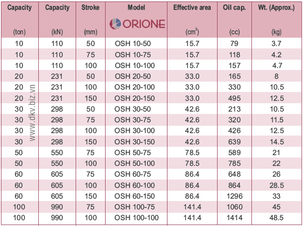 - Kích thủy lực rỗng tâm Orione OSH 10-50, con đội thủy lực rỗng tâm Orione OSH 10-50, Orione hollow hydraulic jack OSH 10-50: là loại kích thủy lực, con đội thủy lực, rỗng tâm, 1 chiều, vỏ thép, có sức đẩy max: 10 tấn, hành trình max: 50 mm, lỗ rỗng tâm (ØD): 20 mm, chuyên dùng kéo rút trong công nghiệp.