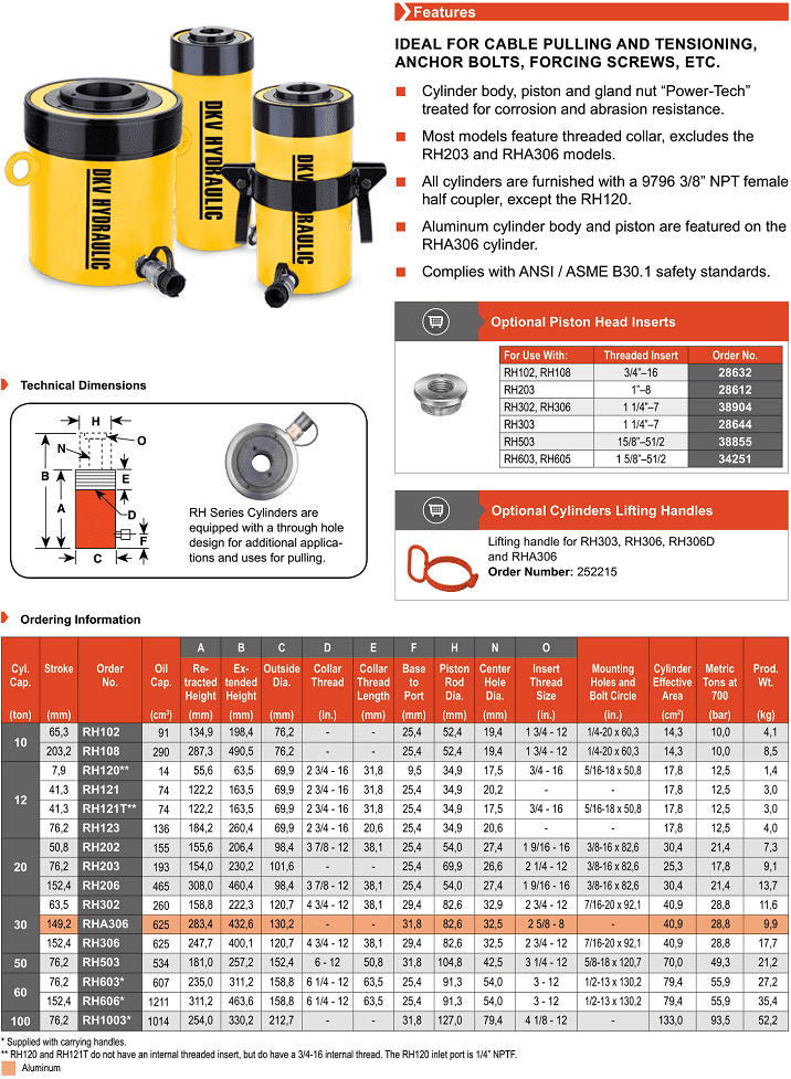- Kích thủy lực rỗng tâm RH102, con đội thủy lực rỗng tâm RH102, Hollow hydraulic jack RH102: là loại kích thủy lực, con đội thủy lực, rỗng tâm, 1 chiều, vỏ thép, có sức đẩy max: 10 tấn, hành trình max: 65.3 mm, lỗ rỗng tâm: 19.4 mm, chuyên dùng kéo rút trong công nghiệp. Được sản xuất copy theo tiêu chuẩn của Power Team với các thông số tương tự.