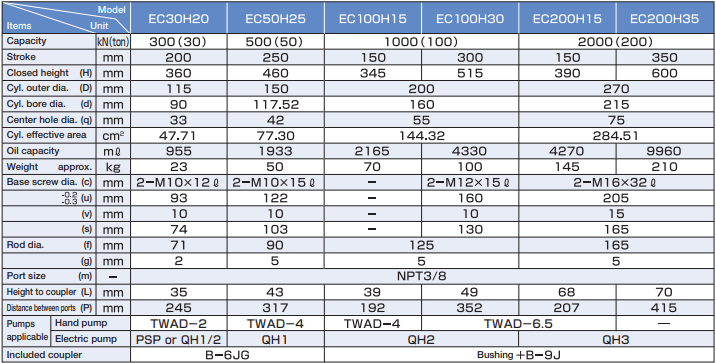 - Áp hoạt động kích thủy lực rỗng tâm Osaka EC200H15 < 720 bar (72 MPa), với coupler tiêu chuẩn 3/8"-NPT cho phép kích thủy lực rỗng tâm Osaka EC200H15 đấu nối nhanh với bơm thủy lực, thông qua ống dây, phụ kiện thủy lực.