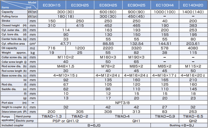- Áp hoạt động kích thủy lực rỗng tâm Osaka EC30H25 < 720 bar (72 MPa), với coupler tiêu chuẩn 3/8"-NPT cho phép kích thủy lực rỗng tâm Osaka EC30H25 đấu nối nhanh với bơm thủy lực, thông qua ống dây, phụ kiện thủy lực.